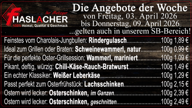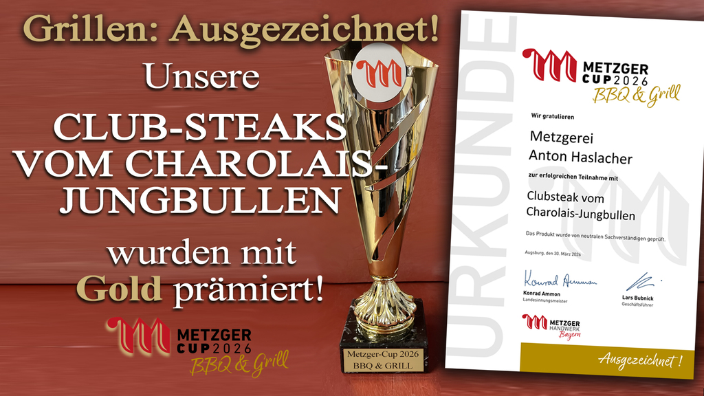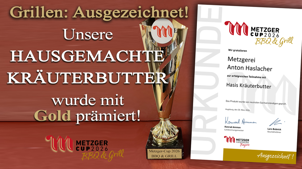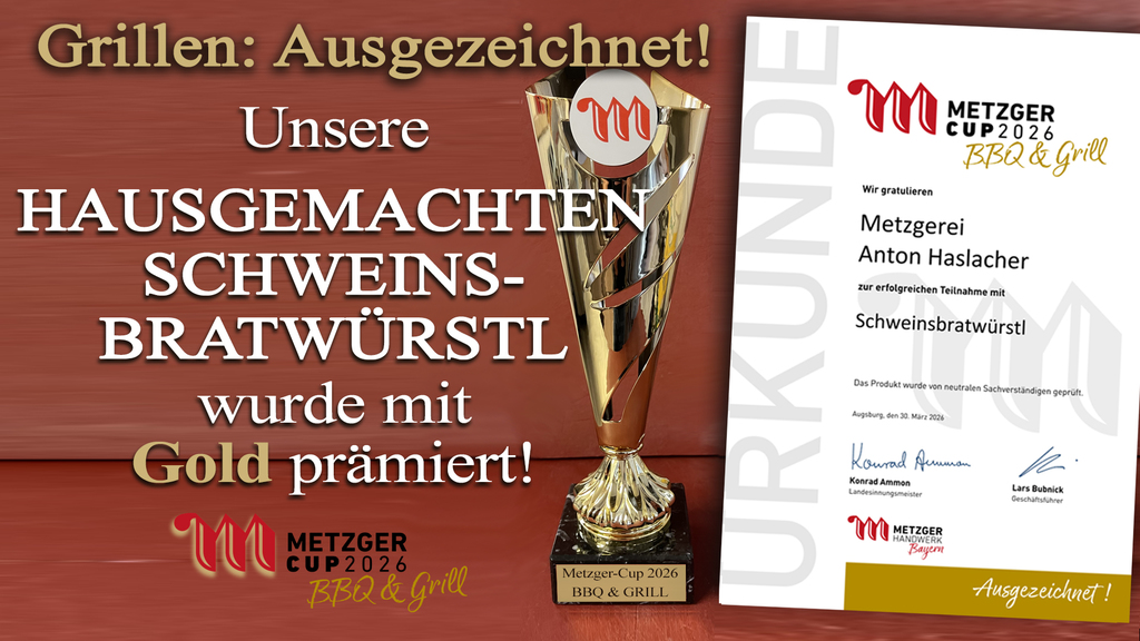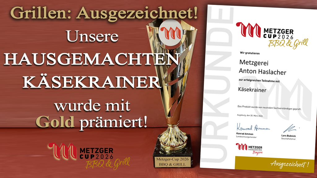 Metzgermeister Anton Haslacher holt sich Pokal beim Sonderwettbewerb um das „Beste Hausgeräucherte“! Bundesminister Alois Rainer und Staatsminister Dr. Florian Herrmann gratulieren außerdem zu fünf mal Gold für ausgezeichnete Produkte aus der Langenpreisinger Metzgerei! Alle Infos zur Produkt- und Qualitätsprüfung 2026 des bayerischen Fleischerverbandes gibt´s auf dieser Seite unserer Homepage.