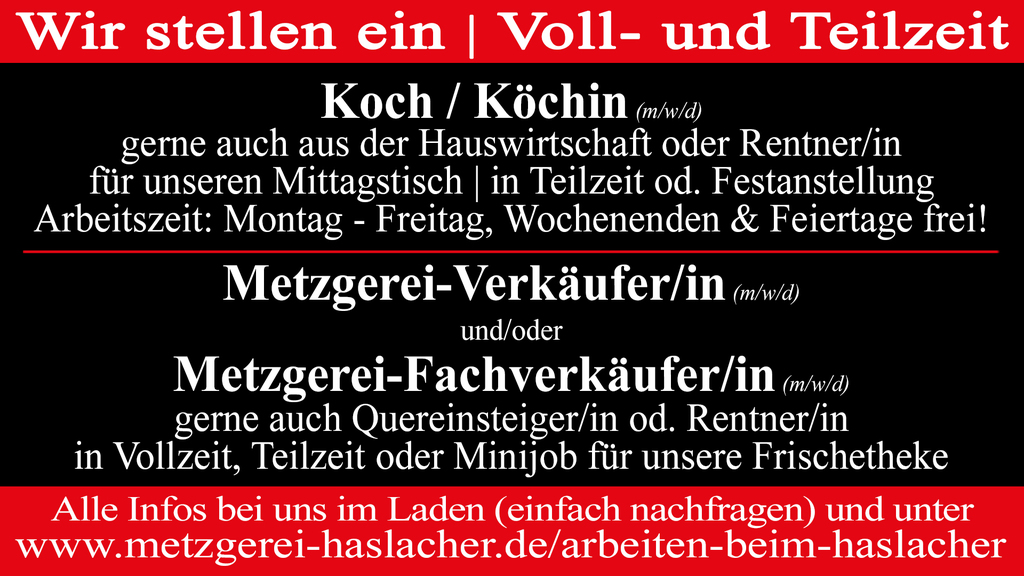 Wir suchen kundenfreundliche Kräfte (m/w/d) für unser Metzgereigeschäft,